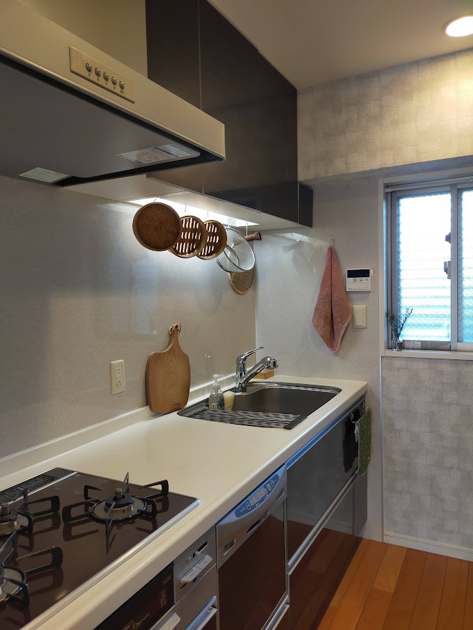 埃に水と油が混じると、途端に落としにくい汚れになります。ガスコンロ周りは油の飛び散りが激しいので、埃と汚れを溜めないように、何も置かず拭きやすい状態にしています。